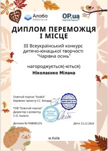 І знову радісна звістка! Мілана Ніколаєнко, Боженко Аріна, Васильєва Вероніка – 1 місце, Мірченко Артур – 2 місце, Михайлов Тихон – 1 місце в ІІІ Всеукраїнському конкурсі дитячо-юнацької творчості “Чарівна осінь”, організованому Освітнім порталом “Алаба”. Стрункі метафори, вишукані епітети та замріяний погляд на світ допомогли ліцеїстам створити неповторний образ осені. Війтаймо Мілану, Артура, Тихона, Аріну, Вероніку та їхнього незмінного натхненника – Тетяну Балагуру. Нових перемог вам!